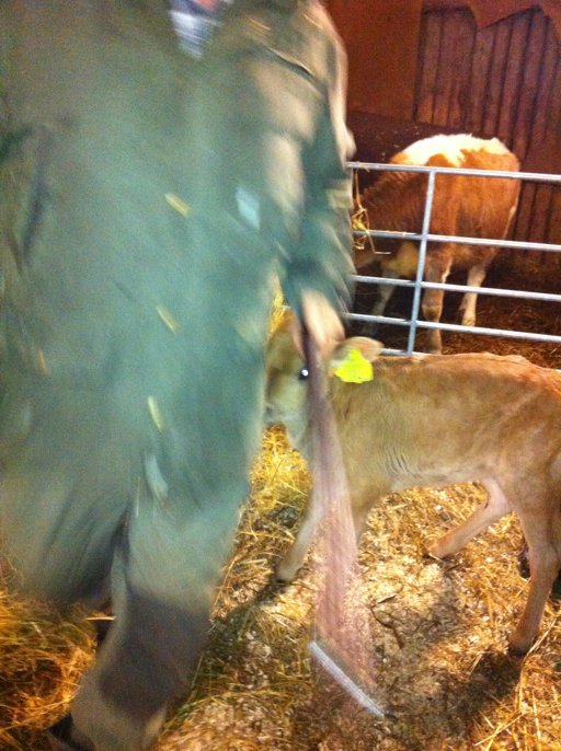 Lill-Greta är 10 dagar gammal och hon har bestämmt sig för att Håkan är en utmärkt extramamma. Hon följer honom som en liten svans och är med och "hjälper till" med sysslorna i ladugården. Våra två varghundar förstår inte hur de blev tre....och vallhunden går i spinn över bristen på ordning. Mest frustrerad är han över husse, som verkar tycka att allt den där ouppfostrade lilla kalven gör är okej. Söt som socker är hon i alla fall./karin